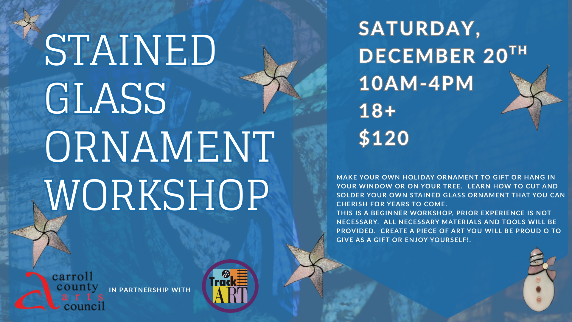 Make your own holiday ornament to gift or hang in your window or on your tree. Learn how to cut and solder your own stained glass ornament that you can cherish for years to come. This is a beginner Workshop, prior experience is not necessary. All necessary materials and tools will be provided. Create a piece of art you will be proud o to give as a gift or enjoy yourself!