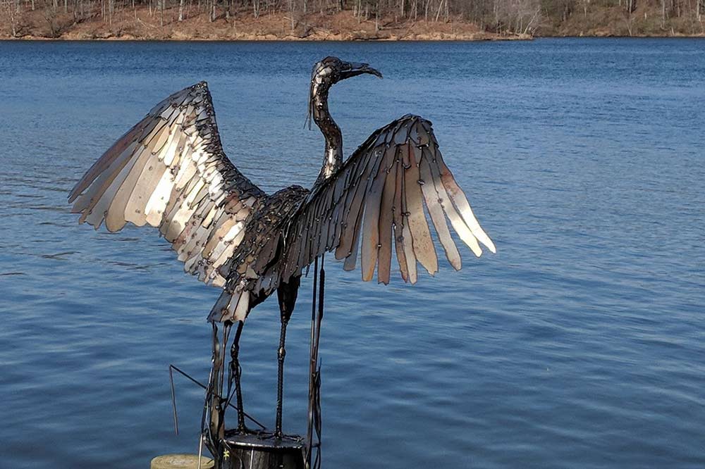 “Great Blue Heron” a welded steel sculpture by Sykesville artist Virginia Sperry. The magnificent bird is located just off shore in Piney Run Reservoir near the boathouse. It is hoped that this stunning piece of public art will inspire visitors to respect and protect the environment and its inhabitants. (2018)