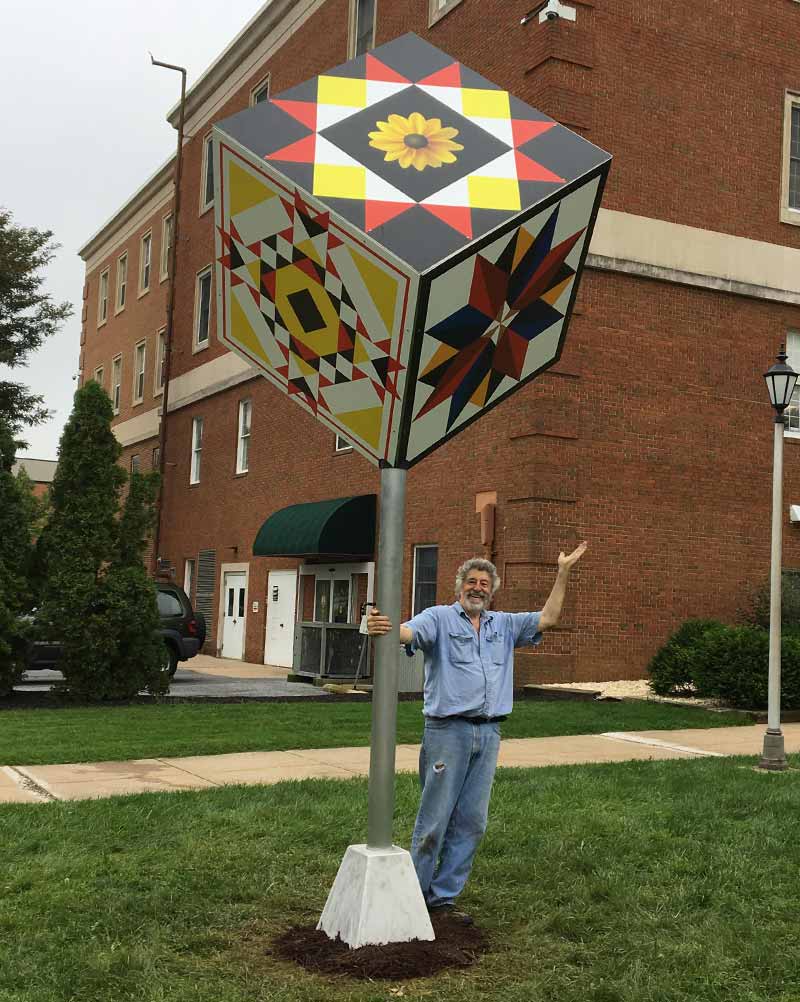Installed in August 2018, this pair of sculptures were created by local artist Charlie Maiorana in honor of the Carroll County Barn Quilt Trail. Situated at the top of a tall pedestal, the cube-shaped aluminum sculptures depict barn quilts on each face.