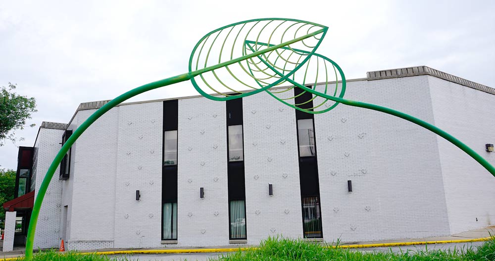“Sprouts” sculpture by Westminster artist Thomas Sterner. Two welded steel sculptures rise from the ground in graceful arches, each with an oversized open leaf, emphasizing their veins and structure (2019).