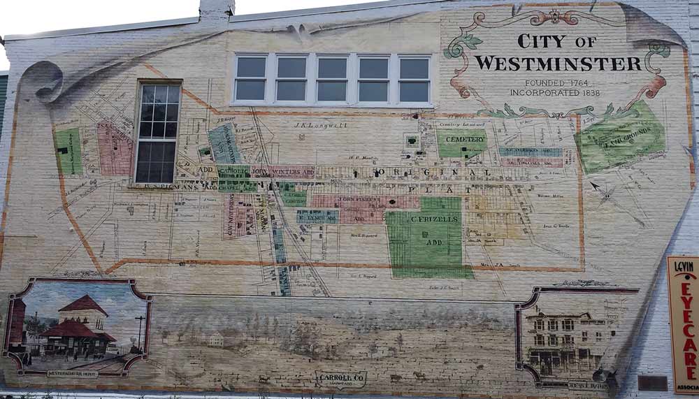 Dedicated in January 2000, artist Lewis Schlitt designed this mural that depicts a map of downtown Westminster in the late 1800s. It took him 40 days to paint the mural along with artists Drury Bynum, James Veenstra, and Thomas Van Damme. On one corner is a picture of the Westminster Railroad Depot. Also depicted are establishments that existed in the late 1800s on West Main Street and elsewhere in Carroll County.